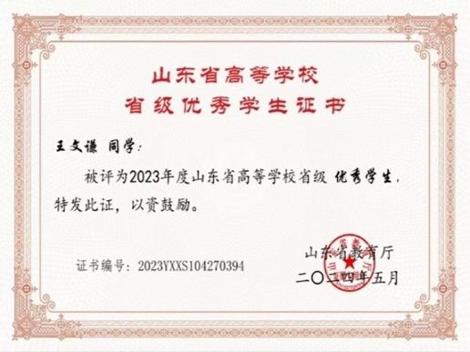 主要获奖:国家奖学金、省优秀学生、校一等奖学金、校优秀学生、校优秀学生干部、校优秀毕业生、校优秀团员、校优秀青年志愿者、校疫情防控优秀青年志愿者、校大学生志愿者暑期文化科技卫生“三下乡”社会实践三等奖。