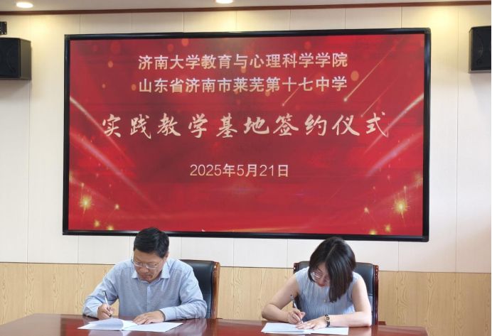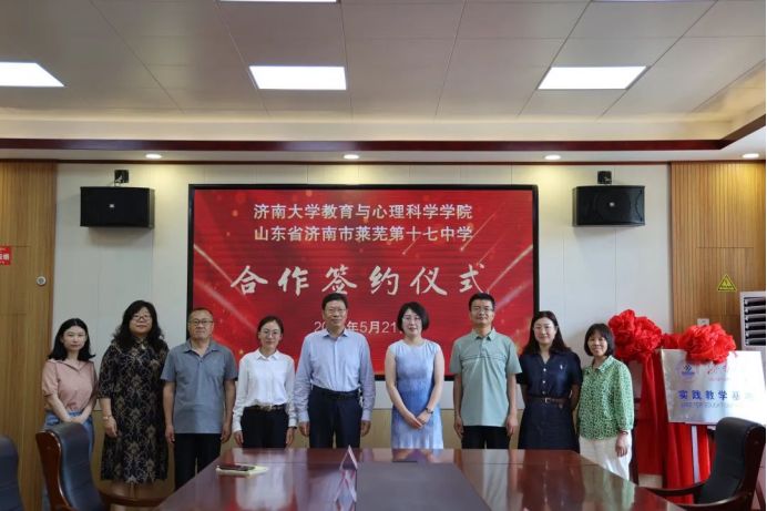 5 月 21 日上午 10:30,学院与济南市莱芜第十七中学本科实践教学基地签约揭牌仪式在莱芜第十七中学明德门二楼会议室隆重举行。学院副院长李开云、应用心理学专业实习负责人黄碧娟,莱芜十七中党委副书记、校长贾玉彦,党委委员、副校长周广伟、周运升等领导及相关教师代表共同出席了本次活动。仪式由莱芜第十七中学党委委员、副校长周运升主持。