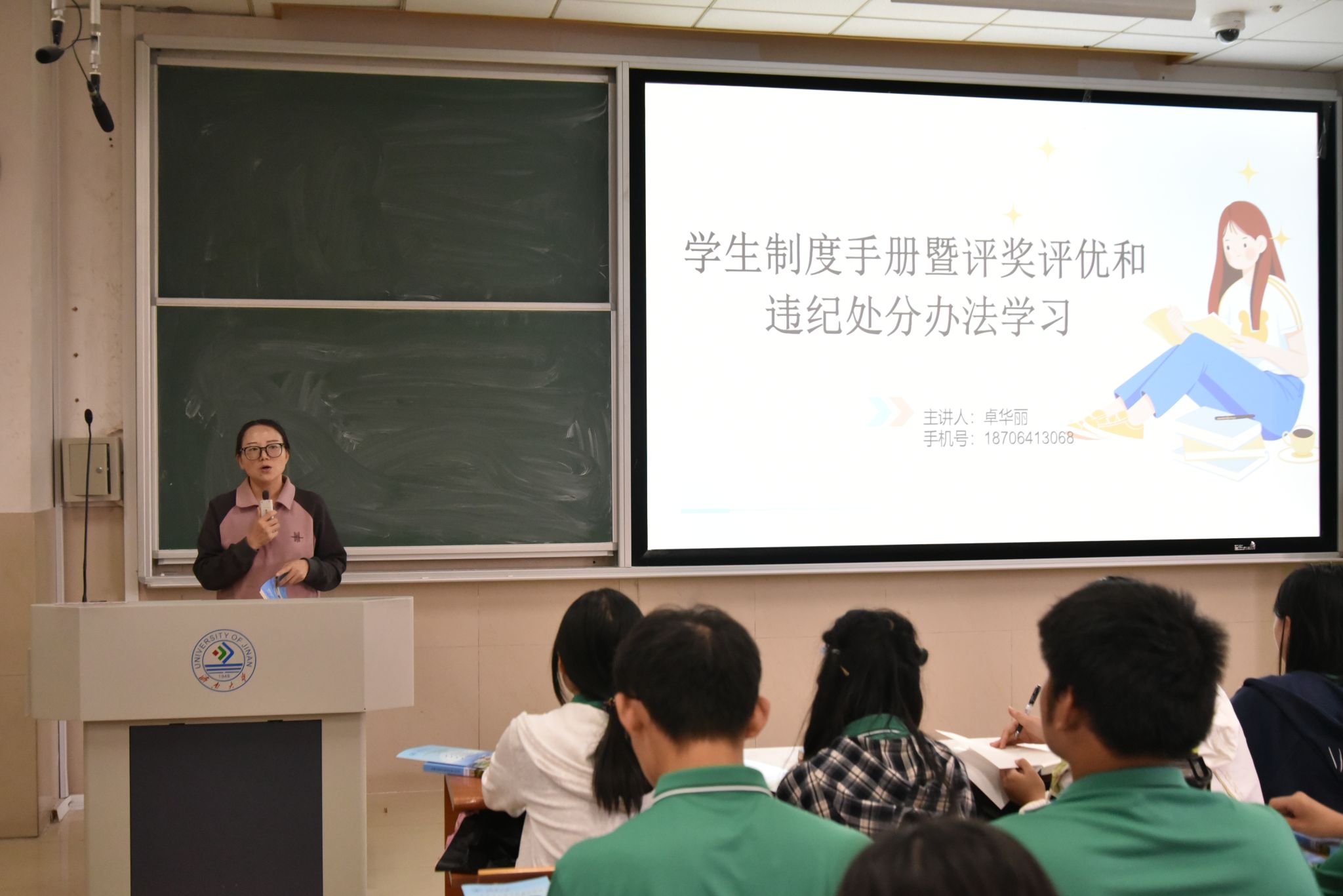 9月19日,学院党委副书记、副院长冯潍以“大学之道——新时代大学生的青春使命与责任担当”为专题进行分享,进一步激发新生将个人理想融入国家发展的使命感;随后,学院卓华丽老师系统讲解学生制度手册,重点解读评奖评优细则与违纪处分办法,引导新生树立规则意识。