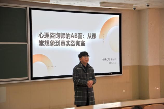 特邀2019级优秀校友、山东中祺心理咨询有限公司资深心理咨询师袁子腾,开展《心理咨询师的AB面:从课堂到诊室的真实跨越》专题分享会,学院应用心理学专业学生现场参会。