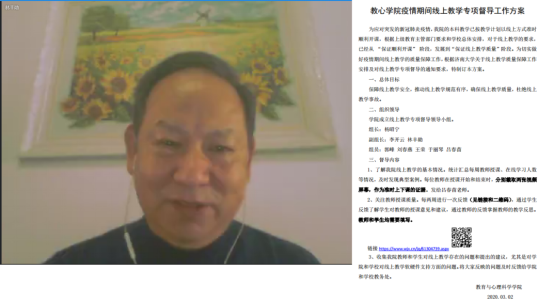 后续线上教学质量,切实做好疫情期间线上教学质量的保障工作,学院成立了以杨昭宁院长为组长的线上教学督导领导小组。学院教学督导委员会主任林丰勋教授起草制定了《教心学院疫情期间线上教学专项督导工作方案》,并在此次研讨会上与全院老师进行了交流沟通。该方案在不增加授课教师额外教学负担的同时,保证学院能够及时了解本院线上教学基本情况、教师的授课质量以及教学效果,以确保疫情期间h动漫