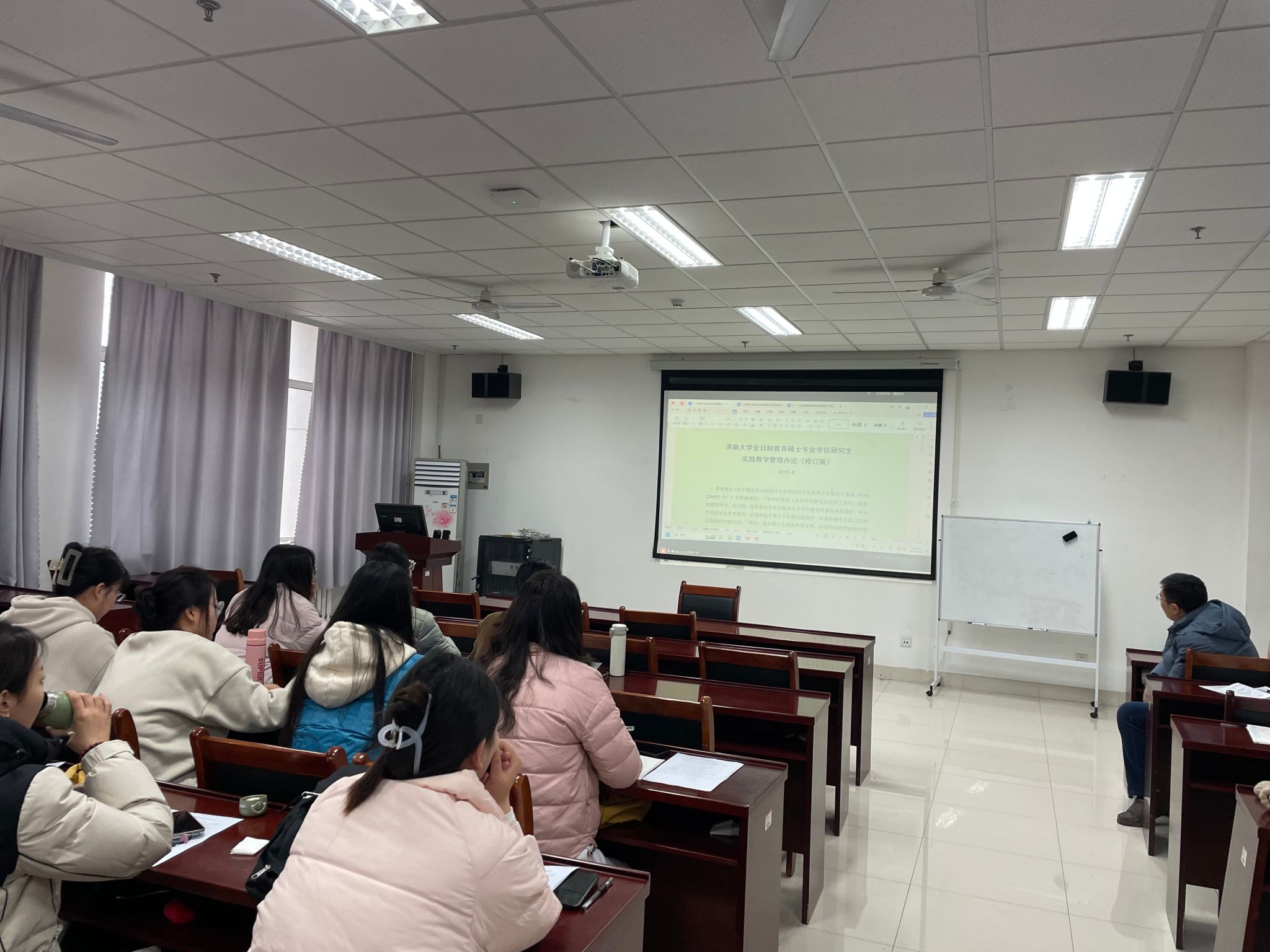 全日制教育硕士专业学位研究生实践教学管理办法》及不同专业领域培养方案对专业实践的不同要求,分别从实习内容、实习时间、实习材料的撰写、实习步骤、教育实习成果展等方面布置了实习任务。她要求所有实习研究生必须全程、主动参加所有的教育教学实习活动,学习优秀教师的师德风范和教育教学方法,并严格按照方案要求的实习时间执行实习工作内容,认真完成各项实习任务,做好实习笔记和实习总结。