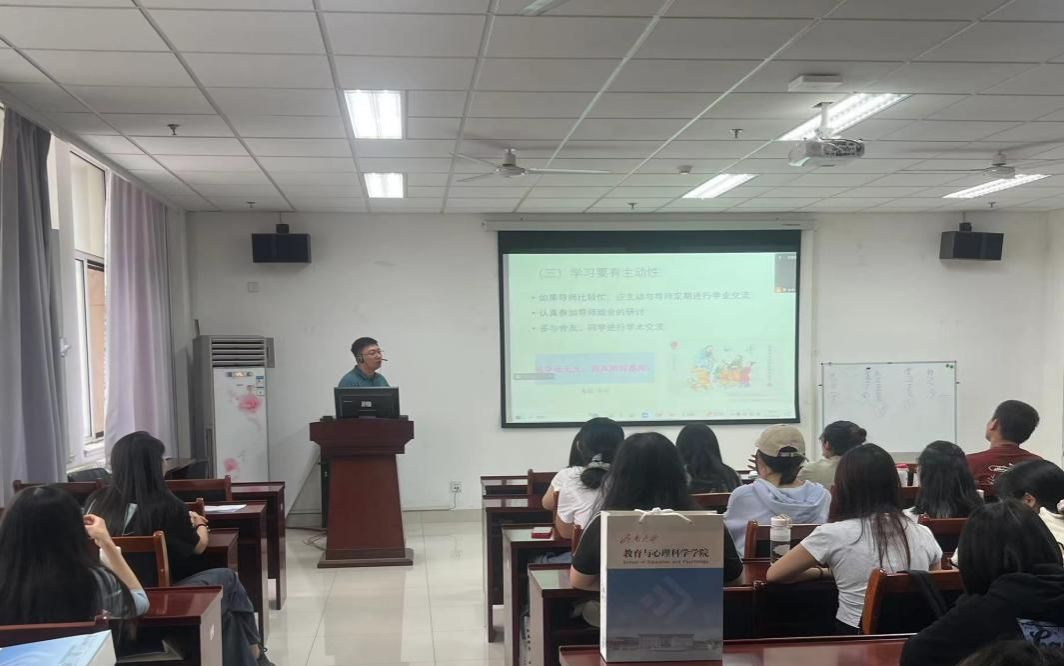研究生国家奖学金评审实施办法》等文件以及学校学位论文评审的相关问题。之后,杨鹏突出强调了研究生阶段目标设立的重要性,由此提出了实用的建议,并结合往届优秀毕业生的案例,引导研究生做好生涯规划,向目标努力前行。最后,他为研究生新生送上了真诚的祝福和期望。