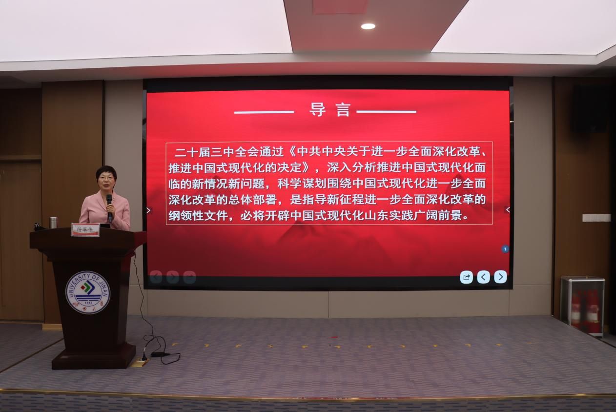 杨翠伟以《深入学习贯彻二十届三中全会精神,推进中国式现代化山东实践》为题,深入浅出地对《决定》内容的3个大板块、15个部分、60条举措进行了总体介绍,通过一系列生动形象的例子介绍了构建高水平社会主义市场经济体制、健全推动经济高质量发展体制机制、构建支持全面创新体制机制、健全宏观经济治理体系、完善城乡融合发展体制机制、完善高水平对外开放体制机制等十四个方面进行了细致的讲解;并介绍了在中国式现代化的进程中,山东省积极进取、勇于争先,紧跟中央的领导和思想,将国家的战略布局转化为具体实践活动的探索之路的模范带头作用。杨翠伟指出,高校应该深刻贯彻党的二十届三中全会精神,积极落实习近平总书记视察山东重要讲话精神,同时,各民主党派也应该协助党委宣传、贯彻党的方针、发挥好民主监督的职责。
