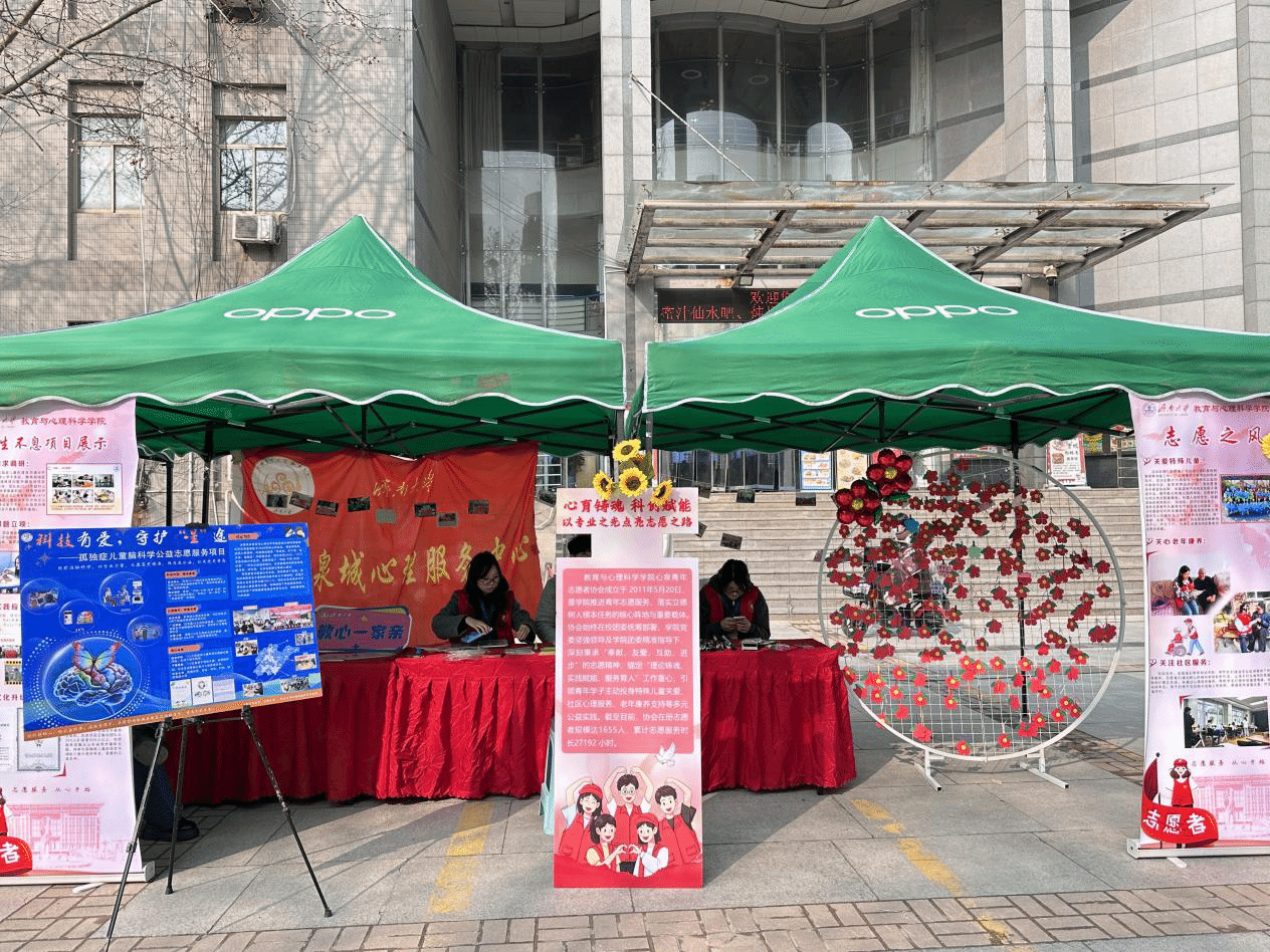 立足特殊教育、心理学专业特色,以品牌建设为抓手、以科创实践为赋能,构建起“专业筑基、科创增效、校地联动、常态长效”的青年志愿服务体系。3月17日,学院携特色志愿项目亮相志愿服务交流展示活动,以实打实的专业服务为现场群众送上暖心关怀,成为校园志愿服务中一道兼具专业温度与青春力量的风景线。