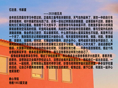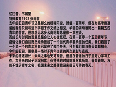 活动期间,参赛者将去年对五四的回忆和今年疫情后的展望用文字表达出来。特教1902班戴文迪同学写到,去年的五四青年节是在备战高考中度过的,虽无聊又疲惫,但是通过“借这个机会想起那段岁月,更多的是感恩和想念,很久没看到这样努力的自己了。”这句话我们能看出,高考前虽然忙碌,但又是充实与满足的一段回忆;特教1902班张雨苗谈到今年五四青年节的特殊,如她所说的“疫情让我们自然而然地承担起了一个当代青年要承担的义务”那样,我们看到了一个又一个青年将自己留在了那个冬天。今年的五四青年节,更像是一场对于青年之责的再次表彰与宣扬。经过作品收集与筛选,h动漫
