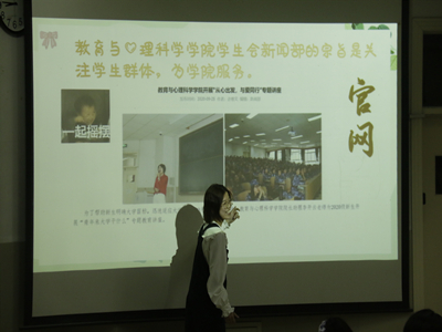 活动伊始,负责人引导新生进入宣讲教室,并分发小零食。主持人开场阐述宣讲目的及意义,宣布宣讲会正式开始。宣讲按照青年发展中心、两个学业创新服务中心的顺序进行,宣讲完毕进入第一个游戏环节,调动同学们的积极性,参与者可获得奖励。游戏结束后进入到第二轮宣讲,顺序依次是纪律中心、文体中心、志愿服务中心、媒体中心进行宣讲。宣讲结束后,进入到第二个游戏环节,看表情猜词语。其中有一个惊喜环节,将过生日的两位同学安排在最后一组,关键词为“生日快乐”,猜出后或负责人公布正确答案后关灯,送上蛋糕,集体唱生日快乐歌。最后,主席们简单发言,而后引导新生们有序离场。