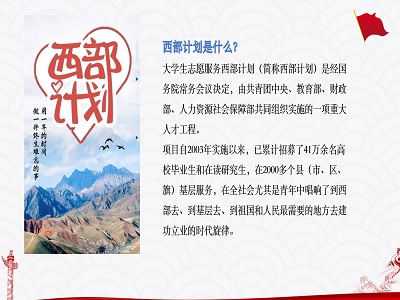 举办西部计划分享交流会活动。本次活动邀请参与往届西部计划的2016届毕业生王超和2021届毕业生韦嘉欣担任主讲,学院有意愿报名参加西部计划的毕业年级学生和非毕业年级学生干部代表参加。活动由学院团委书记王栋主持。