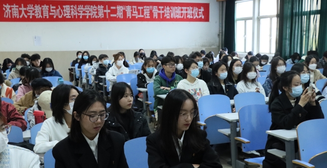 在10J317举行第十二期“青马工程”大学生骨干培训班开班仪式。活动邀请学校“青马工程”第十二期大学生骨干培训班学员刘泽宇、吴泓霖领学,并邀请2022年山东省青年马克思主义者培养工程高校班学员王玉媛进行“青春心向党,奋斗新华章”党史宣讲,学院本期培训班全体成员参加。仪式由教管2202班范晓晴同学和特教2202班吕友情同学主持。